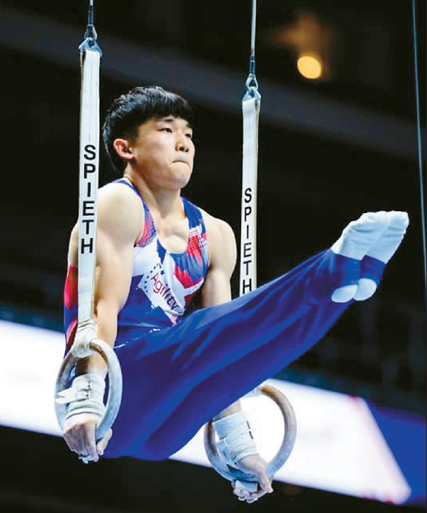 지난 8월26일 열린 'US 짐내스틱스 챔피언십 대회'에서 저스틴 박 군이 링(SR) 기술을 선보이고 있다. [USA Gymnastics Facebook 캡처]