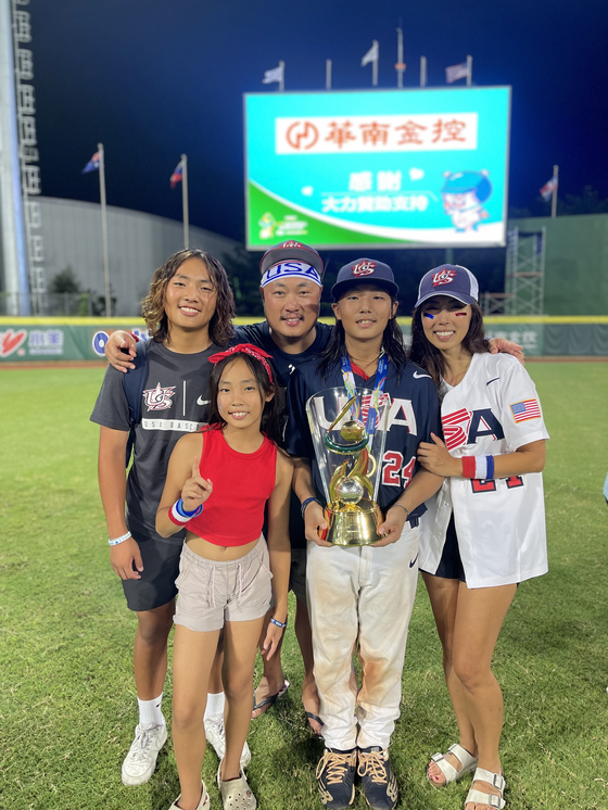 미 대표팀이 12세 이하 야구 월드컵 대회에서 우승을 차지한 후, 브라이언트 주(우승컵 든 이)군의 가족이
