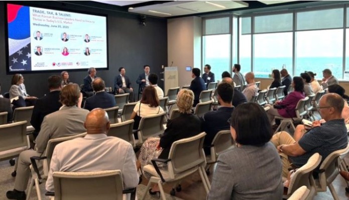 한미동남부상의 경제동향 세미나 달라스조아 0 296 2025.06.26 04:35 25일 애틀랜타 다운타운에서 한미동남부상공회의소는 세미나를 개최했다. 장채원 기자.한미동남부상의 경제동향 세미나한미동남부상공회의소(SEUSKCC·회장 김재천)는 25일 애틀랜타 다운타운 아널골든그레고리(AGG) 사무소에서 미국에 진출한 한국 기업들을 대상으로 경제동향 세미나를 열었다. AGG의 이정복 변호사가 사회로 나선 이 세미나는 트럼프 대통령의 감세법안을 비롯해 무역과 조세 정책, 고용시장 등을 주제로 AGG 소속 5명의 변호사가 토론을 펼쳤다.장채원 기자 ©중앙일보