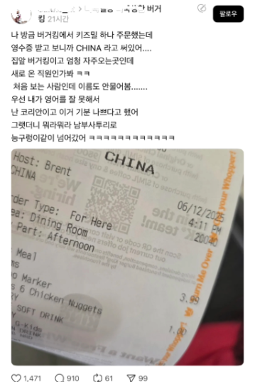 앨라배마의 한 버거킹 매장에서 주문 영수증에 한인 고객의 이름을 ‘차이나’(CHINA)라고 적은 사실이 알려지며 논란이 되고 있다.