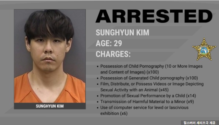 힐스버러카운티 셰리프국은 13일 성명을 통해 김성현(29·사진) 씨를 아동 대상 성범죄 등 총 274건의 혐의로 구속했다고 밝혔다.