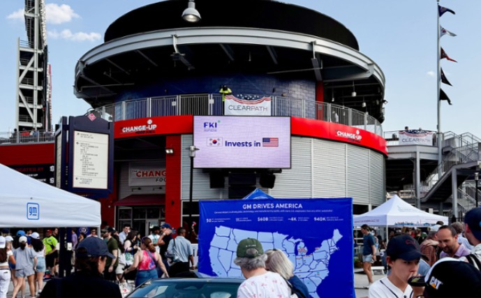 미국 의회 자선야구대회가 열린 11일 워싱턴 DC 내셔널스파크 구장에서 한국의 대미 투자 성과를 알리는 홍보 영상을 상영하고 있다. 한경협 제공