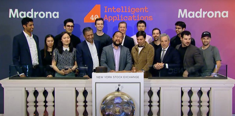‘IA40(IntelligentApplications 40)’ 수상 기업 중 하나로 선정됐다. 이에 따라Madrona 파트너사 및 수상자 대표단과 함께 지난  4일 뉴욕증권거래소 무대에 올라 마감 종소리를울리는 영예를 안았다.