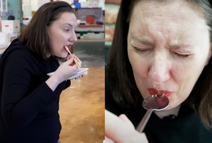 노량진수산시장에서 개불(왼쪽)과 산낙지를 맛보는 CNN 취재진. /CNN