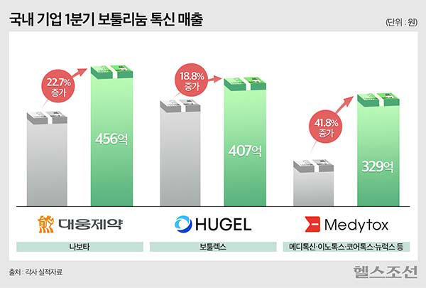 국내 주요 제약사들의 1분기 보툴리눔 톡신 매출이 나란히 증가한 것으로 나타났다. 대웅제약 ‘나보타’와 휴젤 ‘보툴렉스’, 메디톡스 ‘메디톡신·이노톡스·코어톡스·뉴럭스’ 모두 국내뿐 아니라 해외에서도 좋은 판매 실적을 거뒀다.
