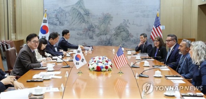 (연합뉴스) 우원식 국회의장(왼쪽)이 17일 서울 여의도 국회에서 아미 베라, 제니퍼 키건스 하원의원 등