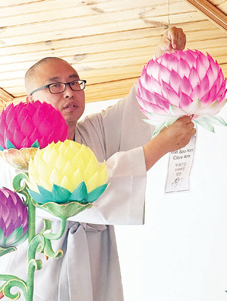 아란야사의 해인 주지 스님이 신도들의 소원을 담은 연등을 달고 있다.