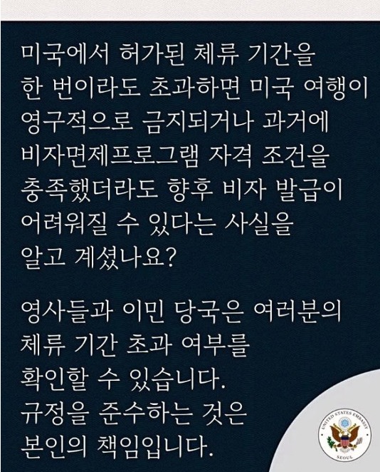 대사관은 이날 소셜미디어 X에 올린 글에서 “미국에서 허가된 체류 기간을 한 번이라도 초과하면 미국 여행이 영구적으로 금지되거나 과거에 비자면제 프로그램 자격 조건을 충족했더라도 향후 비자 발급이 어려워질 수 있다”는 사실을 상기하며 이렇게 밝혔다.