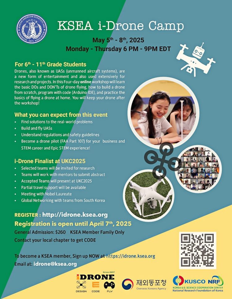 캠프는 5~8일 하루 3시간씩 나흘 동안 온라인으로 진행된다. 온라인(idrone.ksea.org) 등록 마감은 7일 자정까지이며, 신청 시 신용카드로 등록비를 결제하면 된다. 선착순 100명 까지며, 기존 KSEA 회원이 아니어도 신규 가입하여 캠프에 등록할 수 있다.