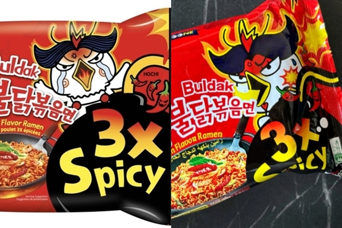 삼양식품 핵불닭볶음면 3X(왼쪽)와 중국산 모조품(오른쪽) 비교. 사진=삼양식품/성신여대 교수팀/SNS 캡처