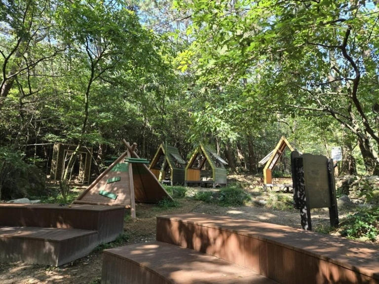 숲속 쉼터는 사랑채에서 장산 방향으로 10분 정도 더 올라가면 폭포사 맞은편 계곡에 있다. 어린이들을 위한 숲 체험 행사 장소로 활용할 수 있는 숲속 집, 전망 공간, 보행 데크, 다양한 종류의 벤치를 배치했다.