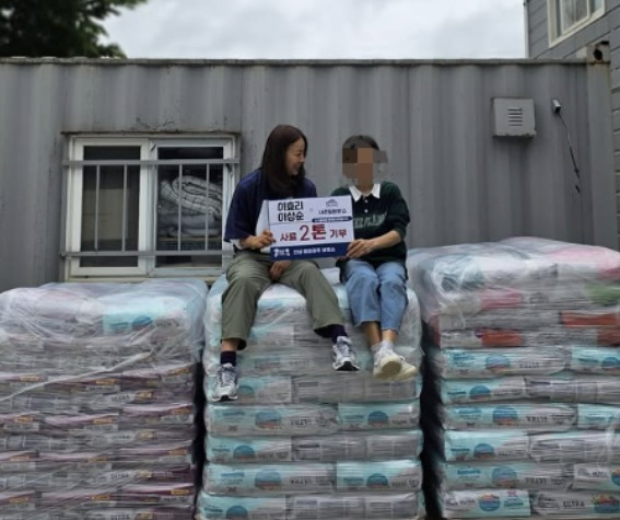 사진 속 이효리는 보호소 관계자와 ‘이효리·이상순, 사료 2톤 기부’라는 플래카드를 들고 사료 포대 위에 앉아 미소 지었다.