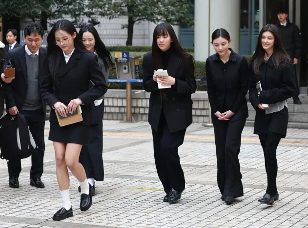 뉴진스(NJZ) 멤버들이 7일 서울중앙지방법원에서 열린 가처분 신청 심문기일을 마친 뒤 법원 청사를 나서고 있다. 연합뉴스