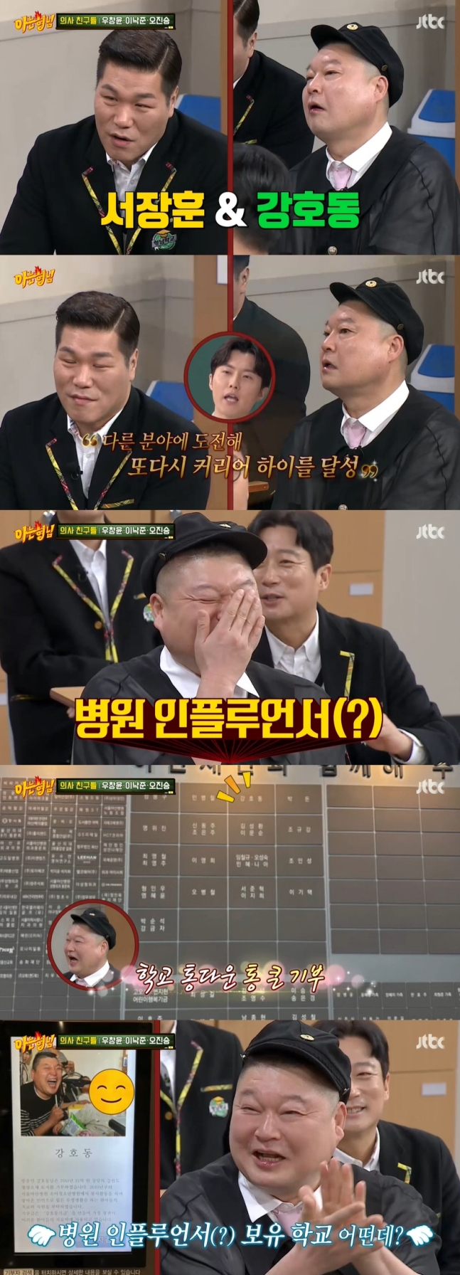 이를 들은 김희철은 "호동이가 아산병원 인플루언서"라고 말했고, 서장훈은 "인플루언서가 아니라 고액기부자"라고 정정했다. 의사들은 입을 모아 "이런 건 알려야 된다. 병원 로비에 (강호동) 사진도 있다"며 강호동을 치켜세웠다.