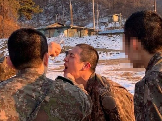 사진 속 진은 군복을 입고 훈련에 임하고 있다. 또 다른 사진에서 진은 화생방 훈련을 마친 후 눈가를 물로 씻어내는 모습까지 고스란히 담겼다.