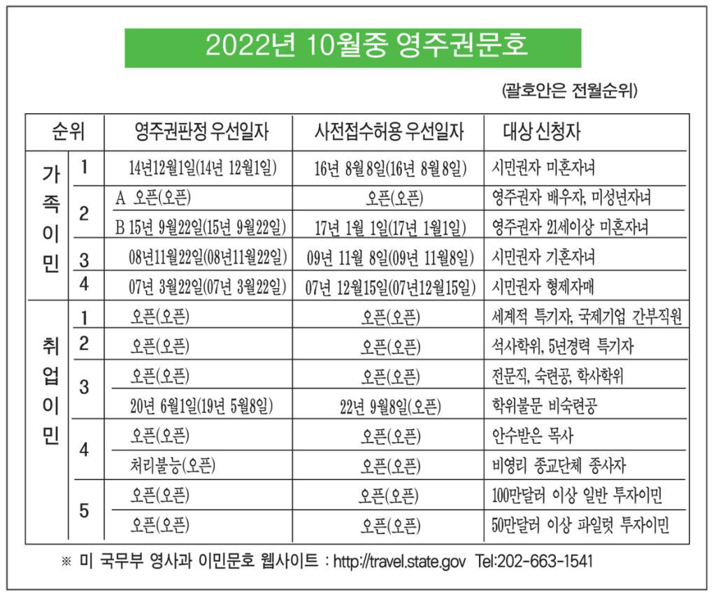 이로써 지난 6월 문호에서 한꺼번에 3년1개월 후퇴한 이후 4개월 연속 동결상태를 이어오던 비숙련직 부문은 새 회계연도를 맞아 숨통을 트게 됐다. 다만 비숙련직 부문의 사전접수 허용 우선 일자가 2022년 9월8일로 새롭게 설정됐다. 이와 함께 10월 문호에선 취업 4순위 종교이민 가운데 비성직자 부문의 영주권 승인 판정일이 처리불능(U)으로 설정됐다.