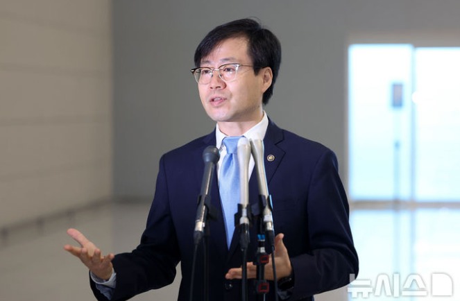 취재진과 만나 정부 입장을 설명하고 있다. 이재명 정부와 트럼프 행정부의 첫 번째 고위급 통상 접촉이 되는 이번 방미에서 여한구 통상교섭본부장이