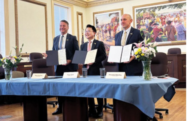 세인트존스대학과 애나폴리스가 춘천시와 업무 협약을 체결한 후 협약서를 보여주고 있다. 왼쪽부터 버클리 애나폴리스시장, 육동한 춘천시장, 스털링 총장.