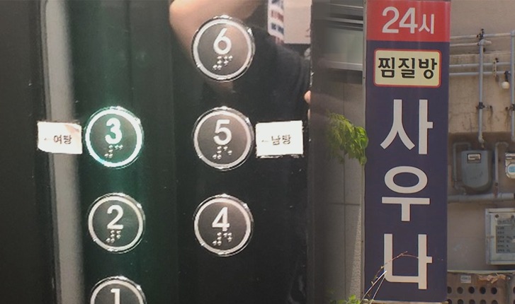 엘리베이터 CCTV엔 4시간전쯤 의문의 남성 무리가 여탕과 남탕 스티커를 바꿔 붙이는 모습이 포착됐습니다.