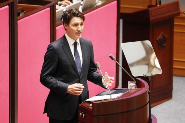 트뤼도 총리는 연설 초반 자신의 아버지가 총리 시절인 1973년 주한 캐나다 대사관을 개설했고, 당시 한국 대사의 아들이 현재 자신의 선임 정책자문관을 맡고 있다고 소개했다. 또 캐나다 TV 프로그램인 ‘김씨네 편의점’이 현지에서 인기가 많다는 점을 언급하며 한국과 인연을 강조했다.