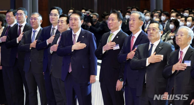 김기문 중앙회장을 비롯해 최진식 중견기업연합회 회장과 최태원 대한상공회의소 회장, 허창수 전국경제인연합회 회장, 구자열 한국무역협회 회장, 손경식 한국경영자총협회 회장 등 경제 6단체장이 모두 자리했다. 이 밖에도 △이재용 삼성 회장 △정의선 현대자동차 회장 △구광모 LG 회장 △신동빈 롯데 회장 △김동관 한화 부회장을 비롯한 10대 대기업 총수도 참석했다.