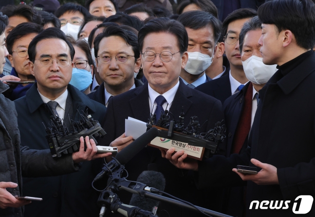 이 대표는 이날 오전 10시35분쯤 성남FC 후원금 의혹과 관련해 수원지검 성남지청 포토라인에 섰다. 제1야당 대표의 검찰 출석은 헌정사상 처음이다.
