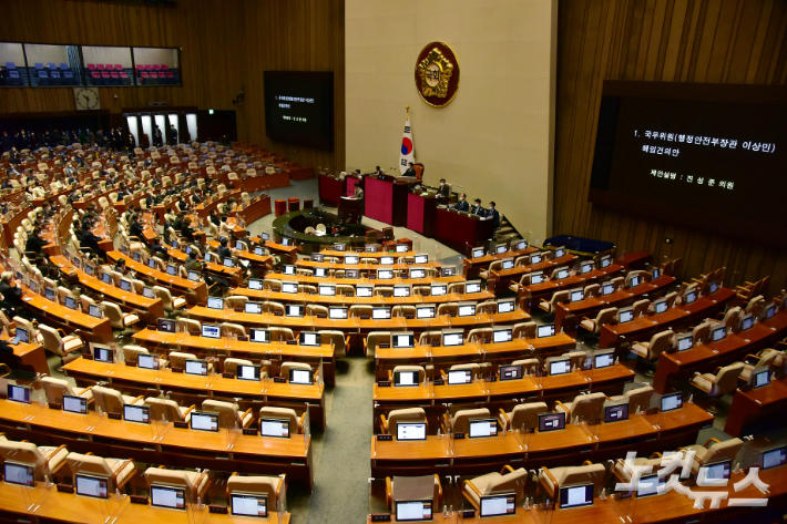 11일 서울 여의도 국회에서 열린 본회의에 이상민 행정안전부 장관의 해임건의안이 상정되자 국민의힘 의원들이 퇴장해 빈자리가 보이고 있다. 윤창원 기자