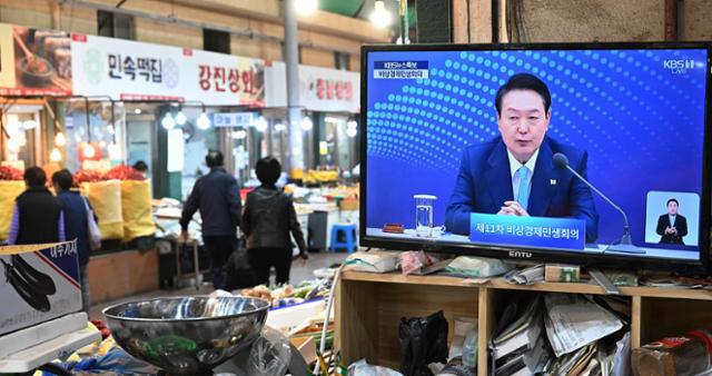 27일 서울 서대문구 인왕시장 한 점포에 용산 대통령실 청사에서 열린 윤석열 대통령 주재 제11차 비상경제민생회의 생중계방송이 켜져 있다. 왕태석 선임기자