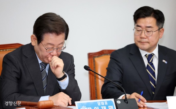 이재명 더불어민주당 대표(왼쪽)가 7일 국회에서 열린 최고위원회의에서 최고위원들의 발언을 들으며 생각에 잠겨 있다. 박민규 선임기자