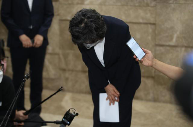 박순애 사회부총리 겸 교육부장관이 8일 오후 서울 여의도 한국교육시설안전원에서 사퇴 기자회견을 한 뒤 고개 숙여 인사하고 있다. 뉴스1