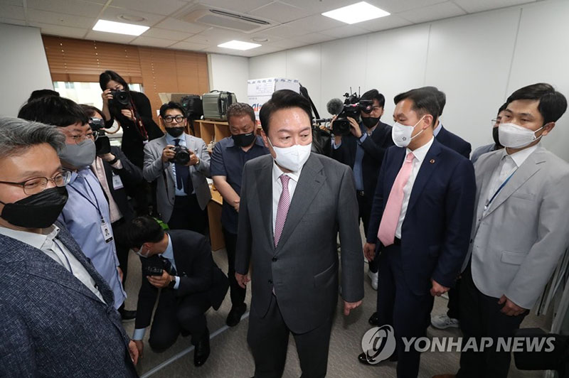 (서울=연합뉴스) 윤석열 대통령이 13일(한국시간) 오후 서울 용산 대통령실 청사 내 기자실을 둘러보고 있다. 2022.5.13 [대통령실통신사진기자단]