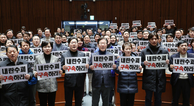 이재명 대표와 박찬대 원내대표 등 더불어민주당 의원들이 8일 서울 여의도 국회에서 속개된 비상 의원총회에서 검찰 규탄 피켓팅을 하고 있다. 연합뉴스