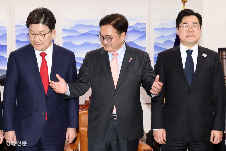 가까스로 열렸지만 ‘굳은 표정’ 우원식 국회의장(가운데)과 권성동 국민의힘 원내대표(왼쪽), 박찬대 더불어민주당 원내대표가