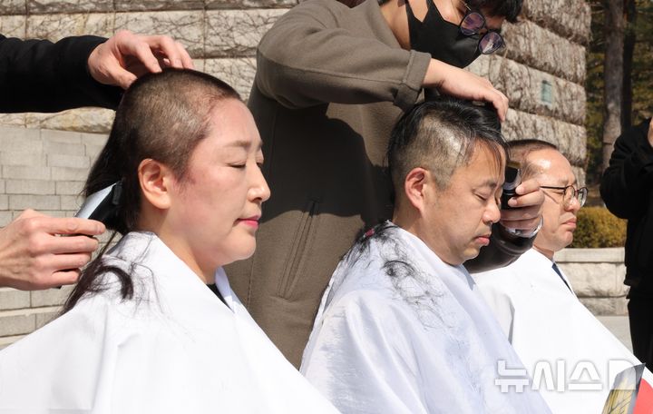 헌법재판소의 윤석열 대통령에 대한 조기 파면 결정을 촉구하며 삭발하고 있다. 2025.03.11. ⓒ 뉴시스