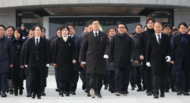 더불어민주당 박찬대 원내대표와 의원들이 1일 오전 서울국립현충원에서 현충탑을 참배한 뒤 이동하고 있다. /연합