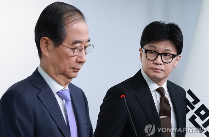 (서울=연합뉴스) 신현우 기자 = 한덕수 국무총리와 국민의힘 한동훈 대표가 8일 오전 서울 여의도 국민의힘 당사에서