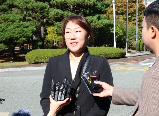 강혜경씨가 23일 오전 경남 창원지검에 출석해 기자들 앞에서 자신의 입장을 밝히고 있다. 연합뉴스