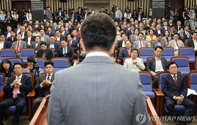 (연합뉴스) 박동주 기자 = 5일 서울 여의도 국회에서 열린 국민의힘 의원총회에서 의원들이 권성동 원내대표의 발언을 듣고 있다. 2025.6.5