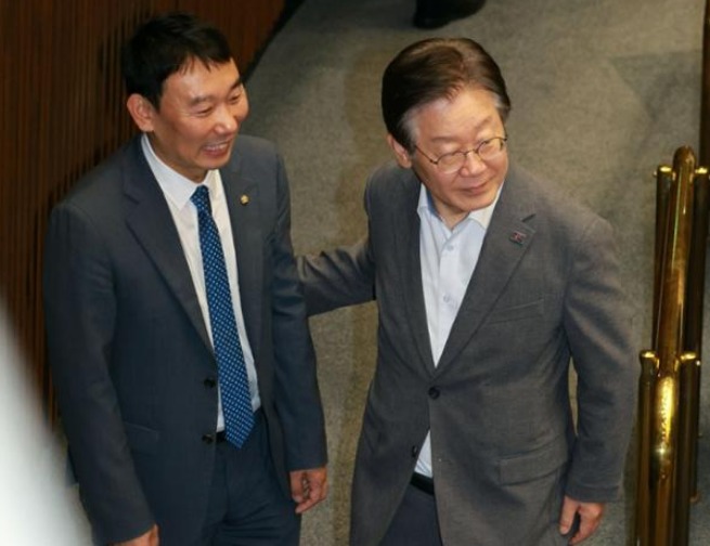 이재명(오른쪽) 전 더불어민주당 대표가 지난 4일 오후 국회에서 열린 본회의에서 '채 상병 특검법' 무제한토론