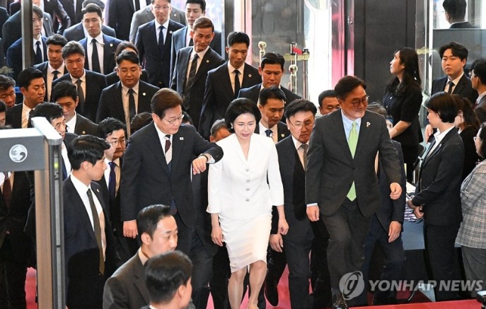 (연합뉴스) 이재명 대통령과 부인 김혜경 여사가 4일 오전 서울 여의도 국회 로텐더홀에 취임 선서를 하기 위해 도착하고 있다. 2025.6.4 [국회사진기자단]