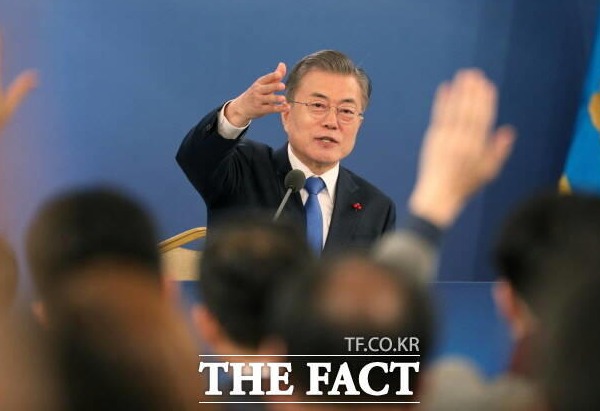 청와대 영빈관에서 '2019 문재인 대통령 신년기자회견'을 갖고 질문자를 지명하고 있다./뉴시스 © 제공: 더팩트