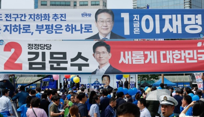 이재명 더불어민주당 대선후보가 21일 인천광역시 부평역 북광장에서 열린 집중유세에서 이 후보와 김문수 국민의힘 대선후보의 현수막이 걸려 있다. ⓒ공동취재
