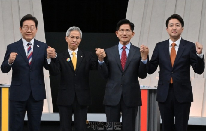 이재명 더불어민주당(왼쪽부터)·권영국 민주노동당·김문수 국민의힘·이준석 개혁신당 대선 후보가 27일 서울 마포구 상암동
