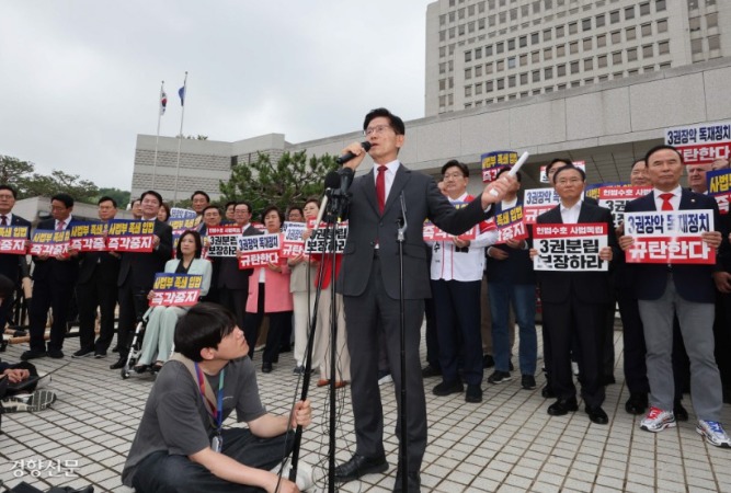 대법원 앞에서 “민주당 규탄” 김문수 국민의힘 대선 후보가 15일 서울 서초구 대법원 앞에서 열린 사법부 수호 및 더불어민주당
